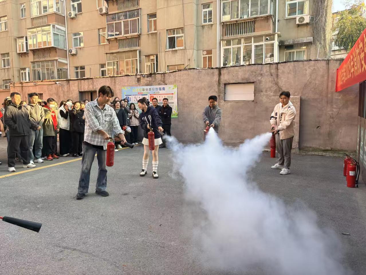 培训结束后,现场组织应急疏散演练。研究生校区全体成员展开模拟疏散演练,师生们在工作人员引导下,有序撤离至指定安全区域。随后在程霞培指导下进行灭火器实操演练,切实掌握灭火技能。此次演练有效检验了师生应对火灾的应急反应能力,进一步巩固了培训成果。