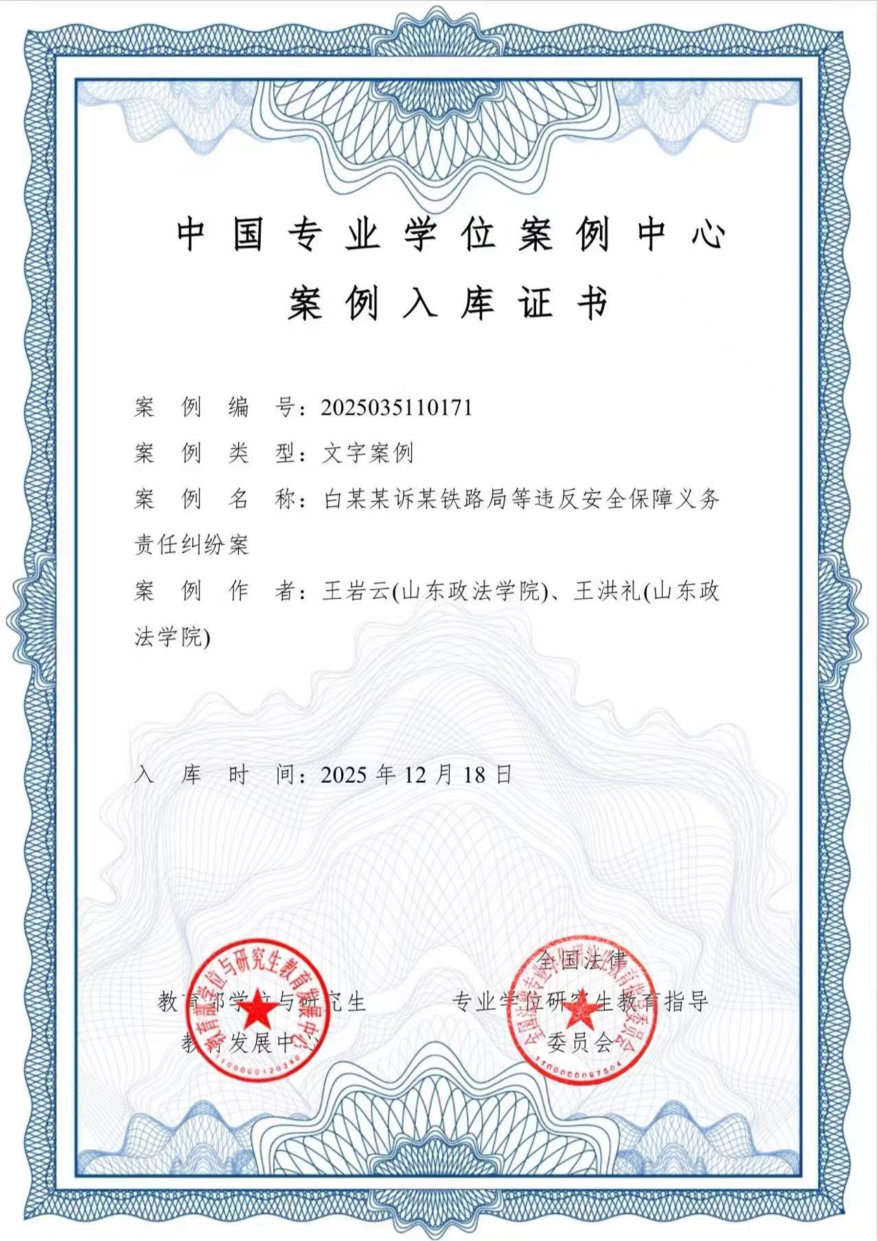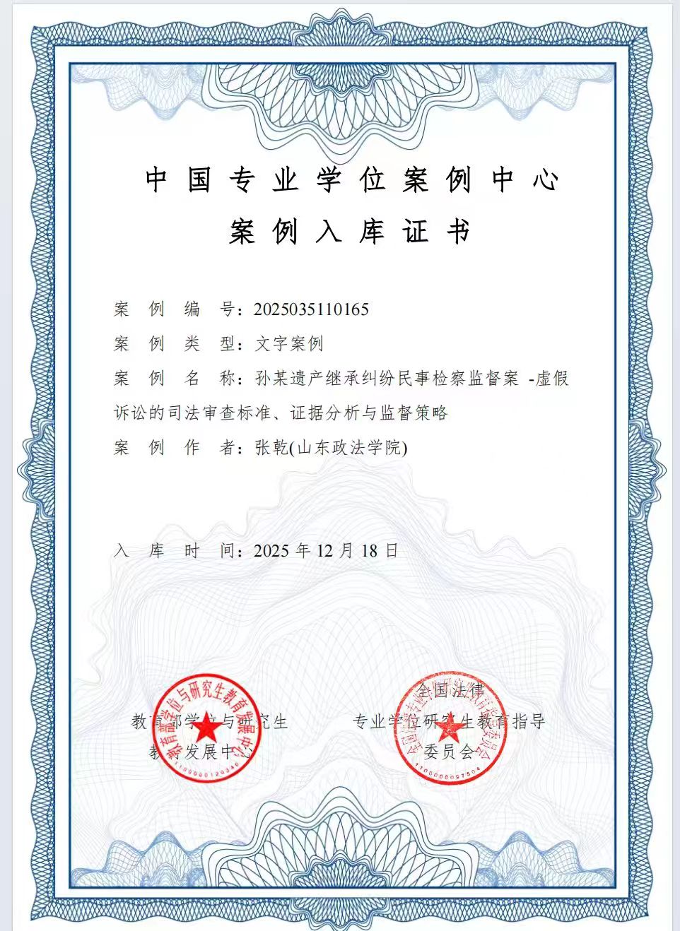 近日,根据全国法律专业学位研究生教指委通知,我校民商法学院张乾老师撰写的法律硕士教学案例——《某遗产继承纠纷民事检察监督案》和王岩云、王洪礼两位老师合作完成的法律硕士教学案例——《白某某诉某铁路局等违反安全保障义务责任纠纷案》,均被中国专业学位案例中心案例库正式收录入库,并获教育部学位与研究生教育发展中心及全国法律专业学位研究生教育指导委员会颁发的入库证书。中国专业学位案例中心是由教育部学位与研究生教育发展中心联合各相关专业学位研究生教指委共同建设的国家级案例教学服务平台,其收录的案例均经过严格的筛选与评审,需具备较强的实践性、典型性与学术价值,能够为专业学位研究生的教学与研究提供高质量的实践素材。