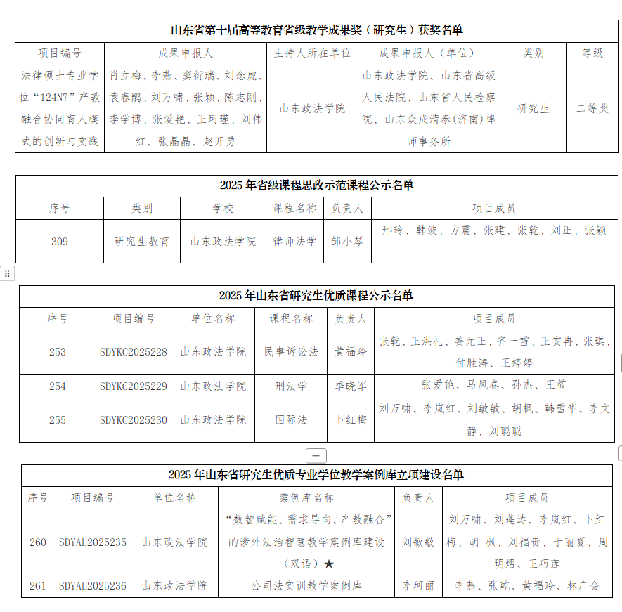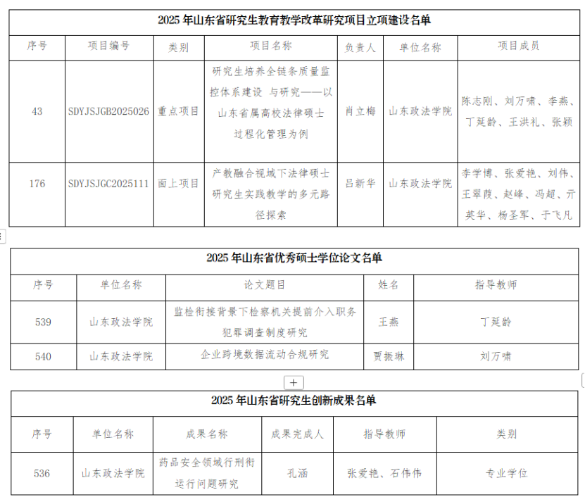 近日,山东省教育厅公布2025年研究生教育相关项目立项等情况,山东政法学院获评教学成果奖(研究生)二等奖1项;省级课程思政示范课程(研究生)1门,获批研究生优质课程立项3门、研究生优质专业学位教学案例库2项、研究生教育教学改革研究项目2项;获评山东省优秀硕士论文2篇、研究生创新成果奖1项。