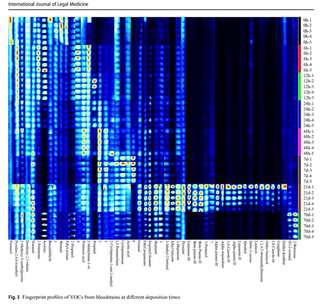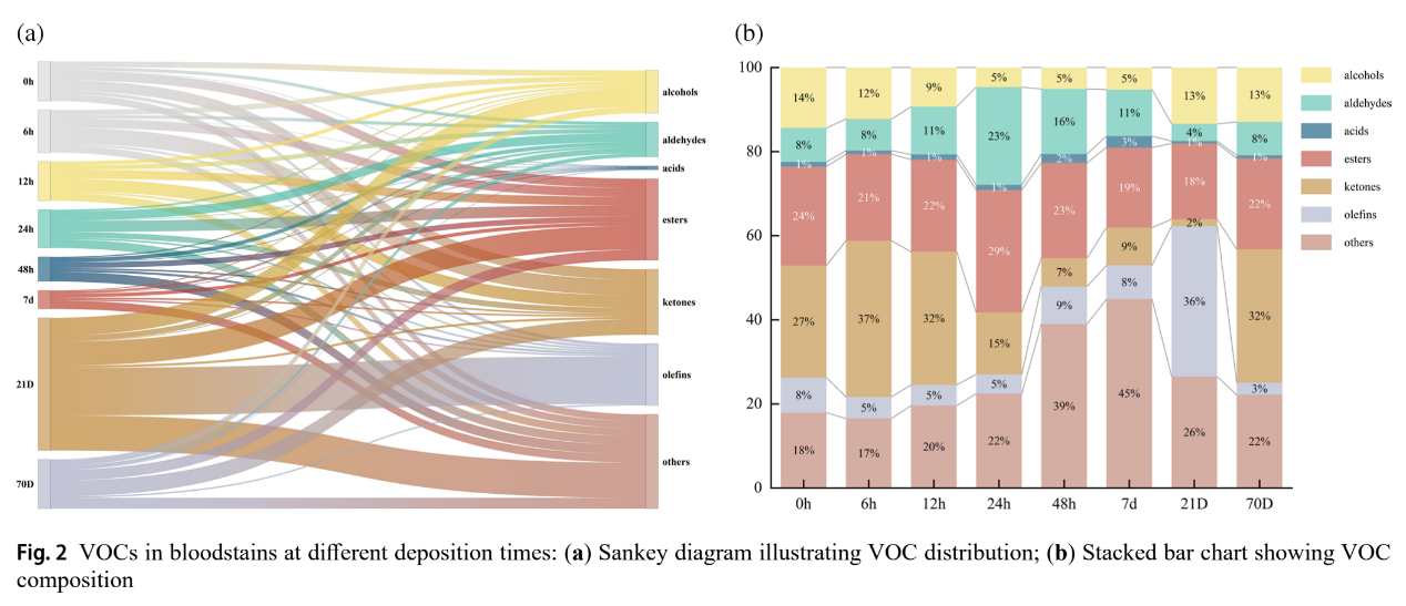 血迹年龄又称血迹沉积时间(TSD),是血迹模式分析的一个关键方面,有助于侦查人员重建事件时间线,核实证人陈述,排除无关证据。因此,寻找高效、准确的血迹年龄检测方法对于刑事侦查具有重要意义。当前,气相色谱—质谱和高效液相色谱已被用于通过检测挥发性有机化合物的事件变化来估计血迹年龄,但对样品预处理和实验条件都具有一定程度的要求,限制了TSD的检测场景,使得TSD推测难度较大。